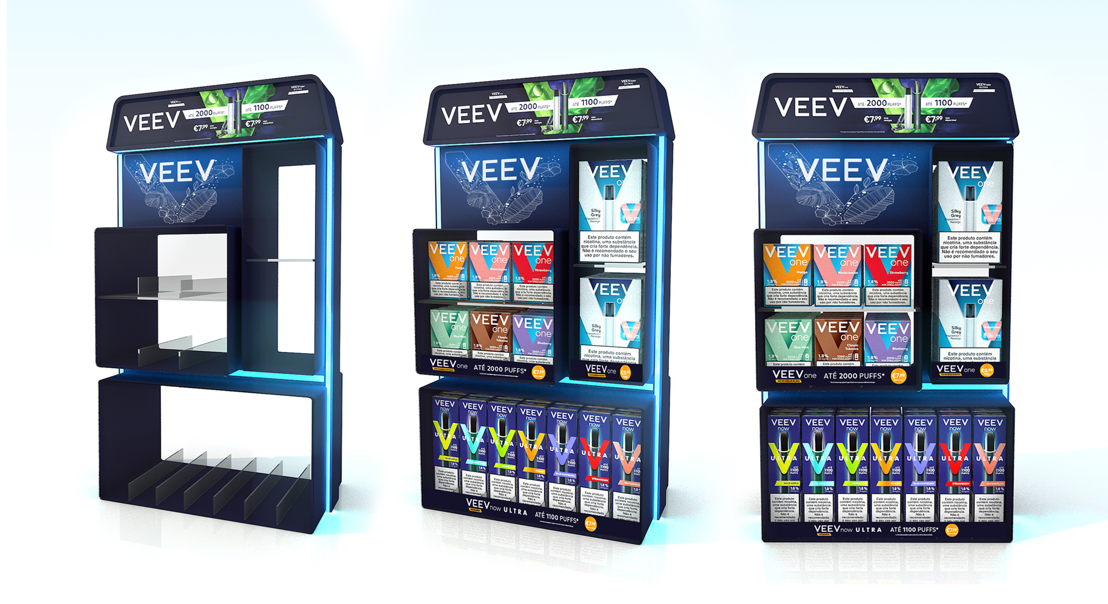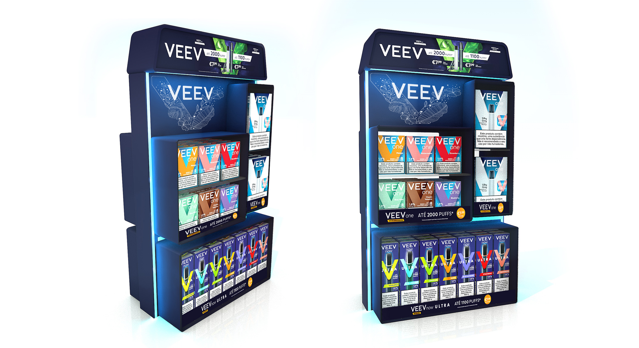 Design of a permanent countertop display for Veev — Philip Morris International’s vaping brand – showcasing its two hero products: the Starter Kit and the Now Ultra.